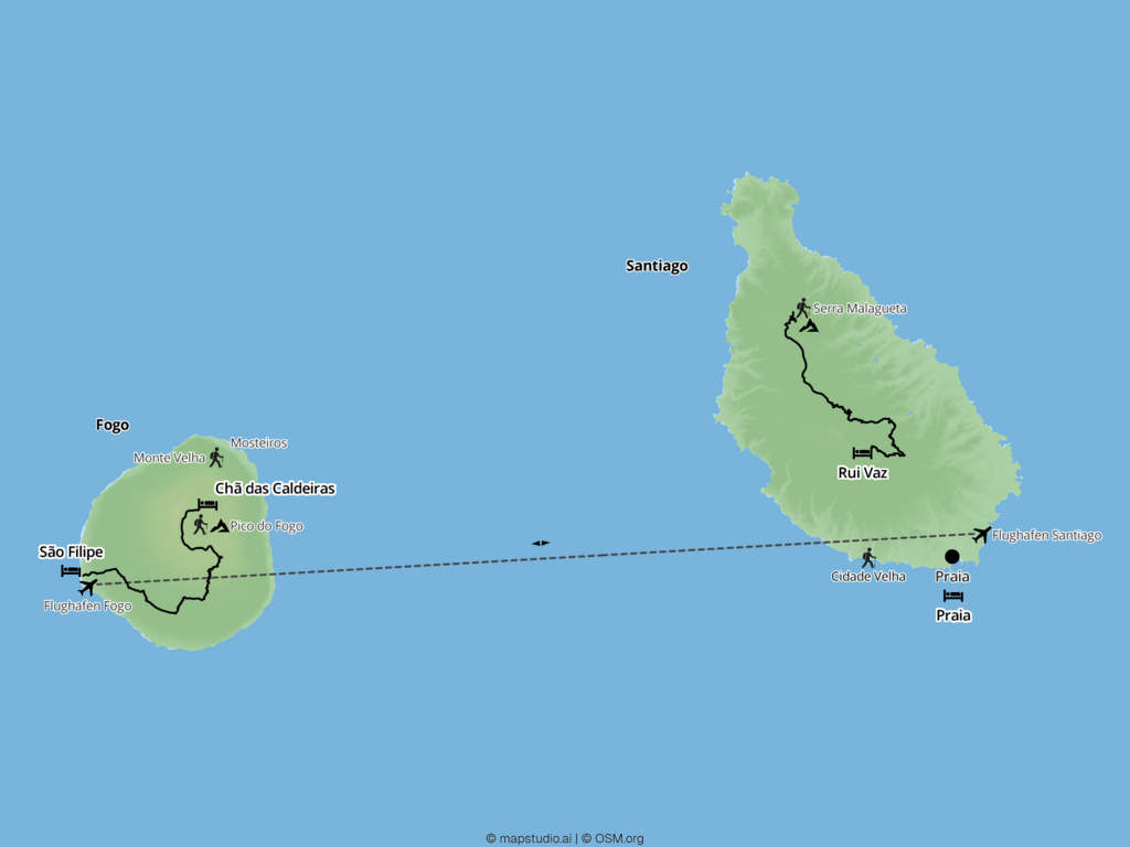 Kombinieren Sie eine Woche "Island-Hopping" auf den südlichen Inseln mit entspannten Tagen in einem Strandhotel Ihrer Wahl. Während der Rundreise entdecken Sie mit Ihrem lokalen Guide die Vielfalt der weniger touristischen Inseln. Sie lernen unterwegs typisch kapverdisches Leben kennen und erwandern die imposante Mondlandschaft um den Vulkan Pico do Fogo. Die zweite Woche verbringen Sie an den schönen Stränden des Atlantiks - lehnen Sie sich zurück.