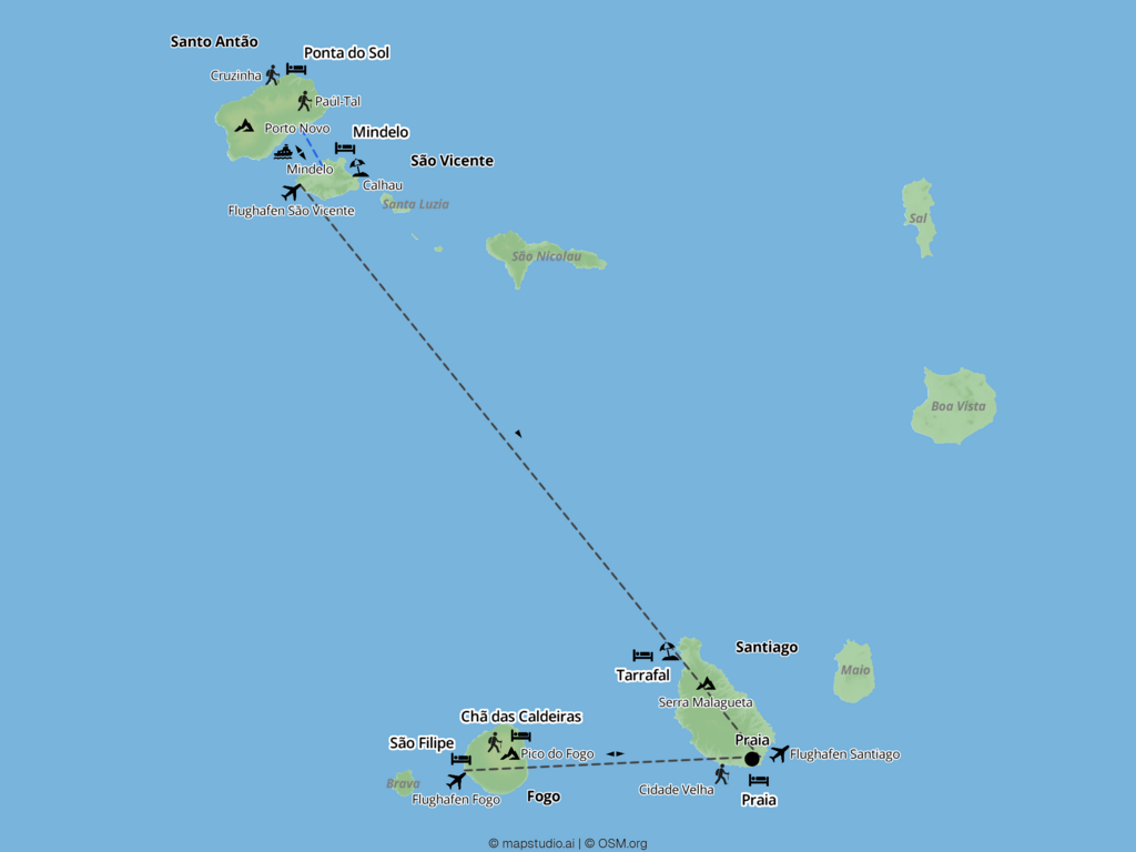Diese Reise ist nicht für Menschen mit eingeschränkter Mobilität geeignet.Flug von Lissabon nach São Vicente mit TAP Portugal. Willkommen auf den Kapverden!