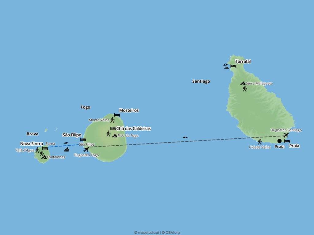 Die Südinseln bieten Vielfalt pur. Wanderungen und Führungen auf der stark afrikanisch geprägten Insel Santiago, der abgelegenen Blumeninsel Brava und natürlich der Vulkaninsel Fogo entführen Sie in Welten fernab unseres trubeligen Alltags. Die Besteigung des höchsten Vulkans der Kapverden ist nur ein Highlight auf dieser Reise. Abgerundet wird Ihr Programm durch Entspannungstage am Meer im Norden Santiagos.