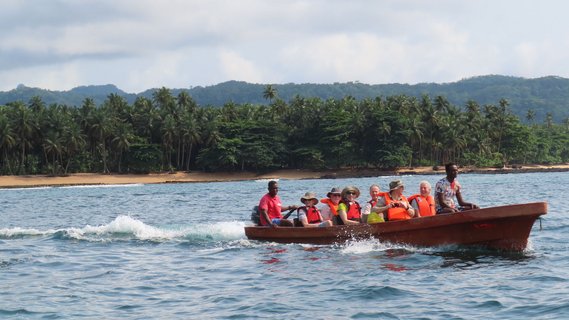 Nach dem Frühstück Bootsfahrt nach Rolas - die winzige Insel ist São Tomés Südspitze vorgelagert und fast vollständig mit Kokosnusspalmen bedeckt. Nach einem kurzen Spaziergang überqueren wir die Äquatorlinie. Wir genießen die schönen Strände auf der kleinen Äquatorinsel, bevor wir am späten Nachmittag mit dem Boot zurück zu unserer Unterkunft am Praia Inhame fahren.