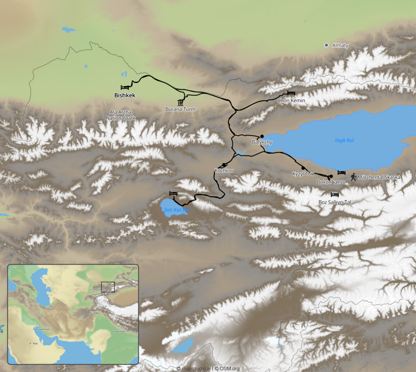 Wüste und Steppe prägen die Landschaft Mittelasiens. Wie eine Oase inmitten dieser wasserarmen Gegend wirken die Gebirgszüge des Tien Shan mit dem im Zentrum gelegenen Issyk Kul-See. Die Hauptstadt Bishkek spricht von Geschichte und Kunst, bevor es Sie durch spektakuläre Täler, entlang von Bergseen bis hin zu Familien im dörflichen Kirgisistan führt. Lernen Sie von Einheimischen, wie die typischen Jurten gebaut werden, lernen Sie mehr über traditionelles Kunsthandwerk und erleben Sie hautnah, was Kirgistan so besonders macht.