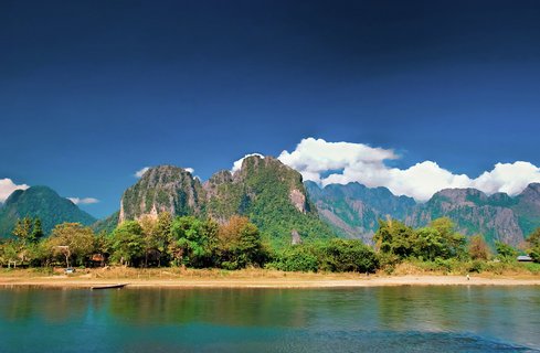 Fahrt mit dem privaten Fahrzeug durch die fantastische Landschaften nach Vang Vieng. Vang Vieng liegt im langgestreckten Tal des Nam Song-Flusses.