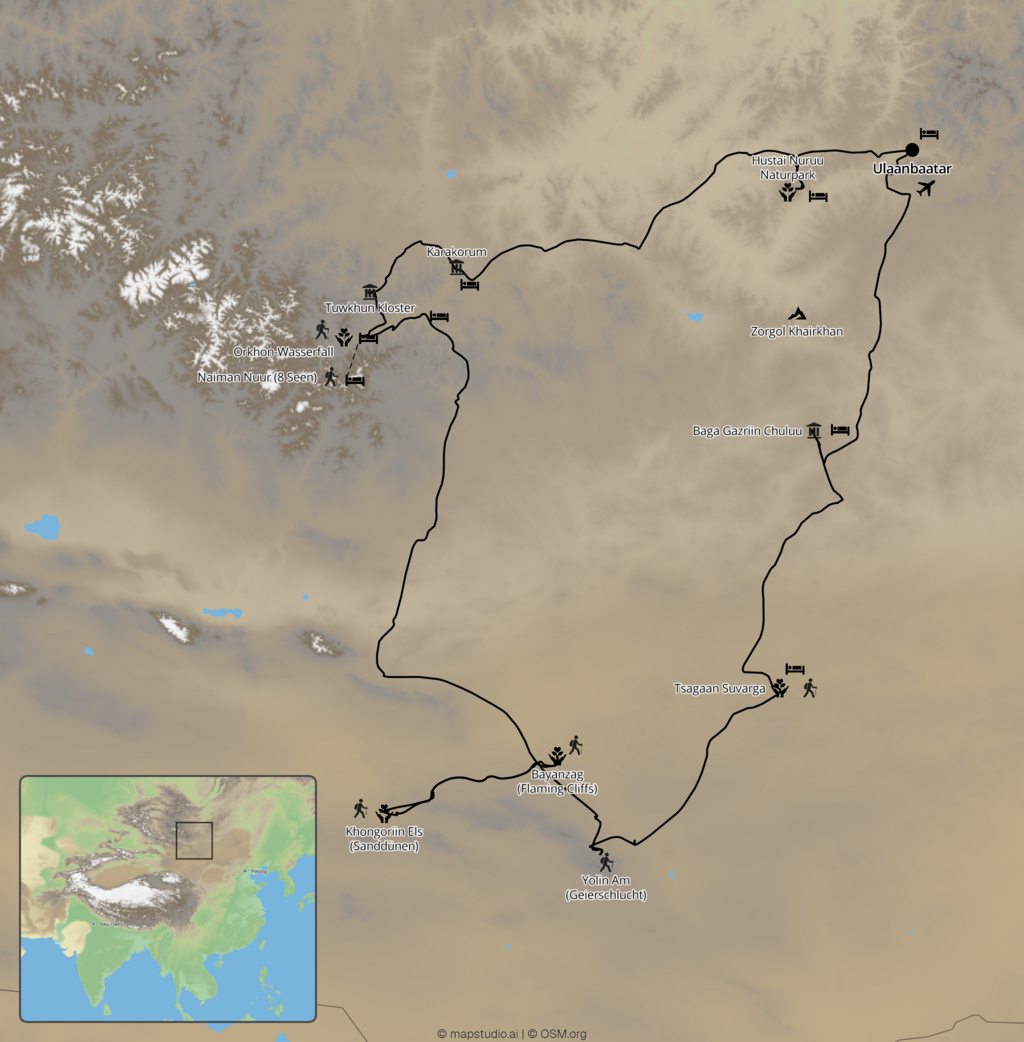 Bedingt durch das Nomadentum ist in der Mongolei alles ständig in Bewegung. Dinge können sich sehr schnell wandeln, Familien wohnen in diesem Monat woanders als im letzten… – deshalb ist es auch möglich, dass nicht alle Programmpunkte genau in der Reihenfolge wie beschrieben stattfinden werden. Inhaltlich bedeutet dies aber keinerlei Änderungen des Programms. So findet eine Wanderung vielleicht am Morgen anstelle des Abends statt, eine Nomadenfamilie wird an einem anderen Tag besucht (oder einfach noch eine weitere, der wir bei einer Wanderung begegnen) oder die buddhistische Andacht in einem anderen Kloster erlebt. Ein Schuss Flexibilität und Spontaneität werden diese Veränderungen zu besonderen Erlebnissen werden lassen und den Reisegenuss noch erhöhen – echt mongolisch eben!