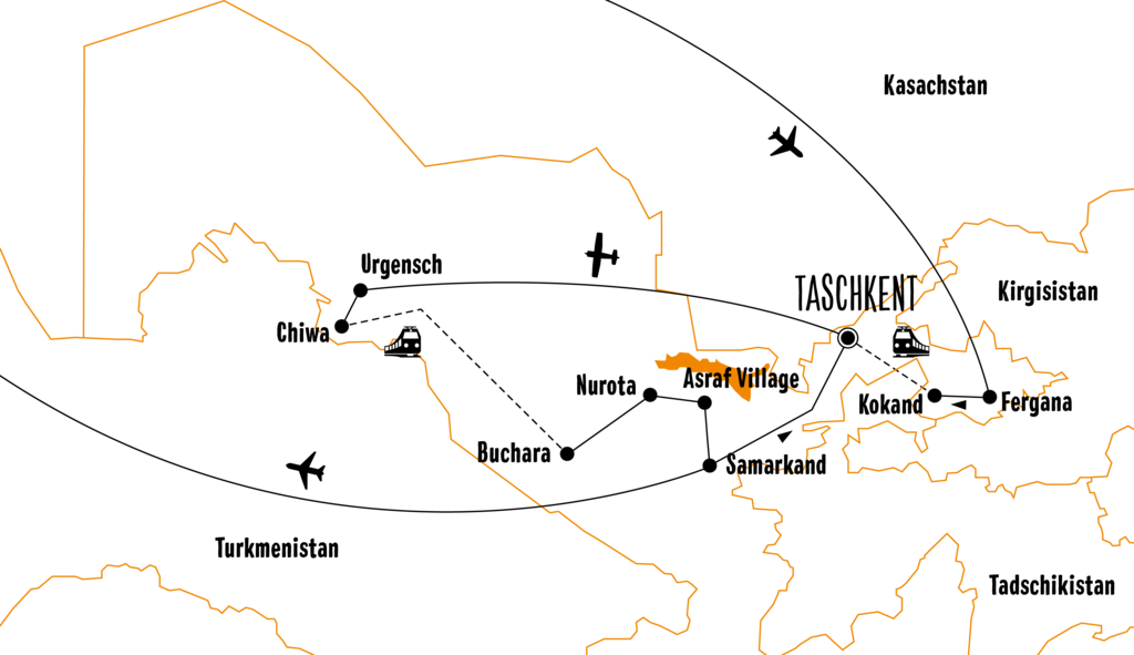 Die Anreise erfolgt mit von Frankfurt nach Taschkent ab verschiedenen deutschen, österreichischen oder Schweizer Flughäfen mit Turkish Airlines oder Uzbekistan Airlines via Istanbul. Der Rückflug startet von Samarkand aus zurück nach Deutschland.