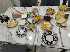 Im Dorf Asraf werden wir von der herzlichen Gastfreundschaft der Familie empfangen, die eine einladende Privatunterkunft mit einem großen Garten voller Obstbäume besitzt. Es ist ein ruhiger Ort, der den authentischen Charme des ländlichen Lebens in Usbekistan widerspiegelt.