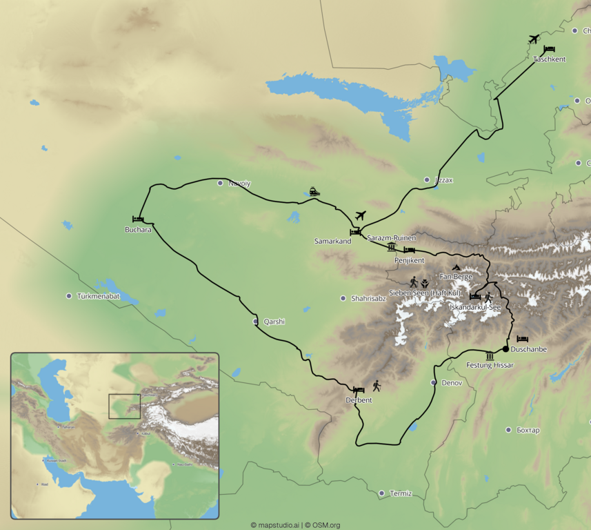 Usbekistan und Tadschikistan zeigen sich auf dieser Kombi-Reise von ihrer lebendigen und aktiven Seite. Wir bewegen uns zwischen historischen Gassen, eindrucksvollen Gebirgstälern und ruhigen Seen. Buchara, Derbent, Dushanbe, Iskandarkul, Penjikent und Samarkand verbinden kulturelle Eindrücke mit Naturmomenten, die im eigenen Tempo erlebt werden können. Eine Reise für alle, die an Geschichte, Kulinarik, Kunst und Tradition gleichermaßen interessiert sind wie an Entdeckungen auf Wanderungen inmitten der Natur.