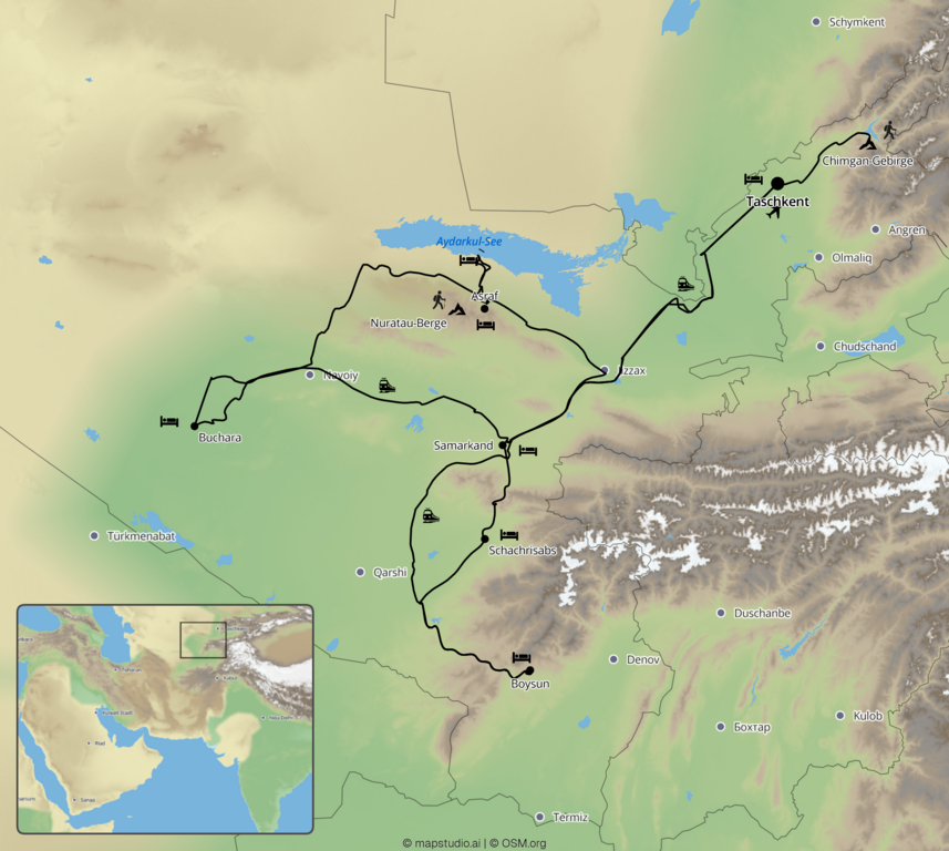 Usbekistan ist ein Potpourri aus Farben, Gerüchen und erscheint oft wie ein Märchen. Erleben Sie das Land mit seinen faszinierenden Städten, aber auch bei Wanderungen durch eine wilde Natur zwischen Bergen und Wüste. Schlendern Sie in Taschkent von lebhaften Basaren zu historisch-architektonischen Denkmälern, erleben Sie Moscheen und traditionelles Handwerk in Buchara und gehen Sie mit Kamelen auf eine Reise zwischen Berg- und Seelandschaften. Lassen Sie sich entführen in ein Land voller religiöser und historischer Sehenswürdigkeiten, farbenfroher Märkte sowie weiter Naturlandschaften.