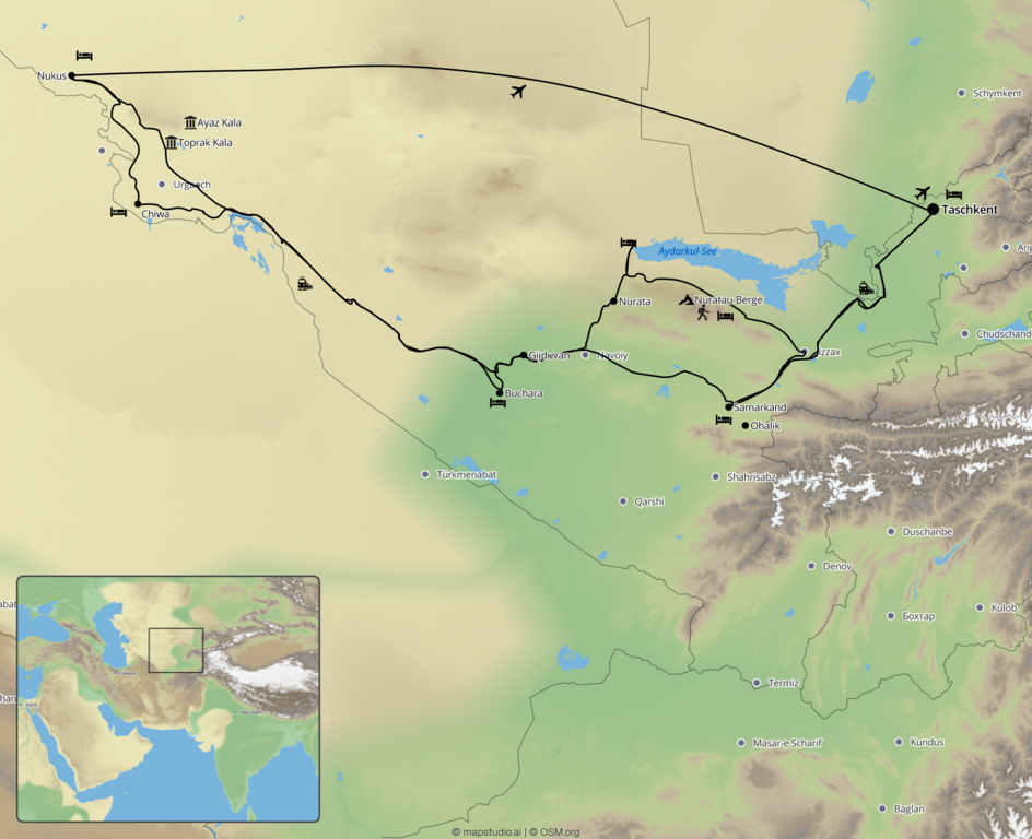 Gerne buchen wir Ihnen Flüge für die Anreise dazu. Wir empfehlen hierfür Direktflüge mit Uzbekistan Airlines ab/an Frankfurt nach Taschkent jeden Montag, Donnerstag und Samstag.