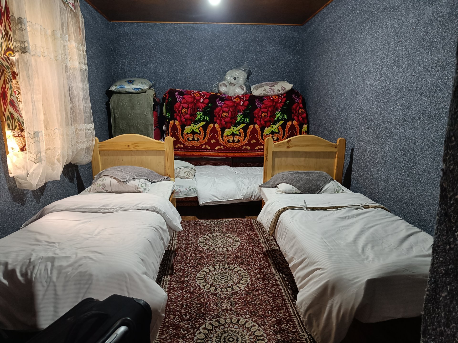 Im Dorf Asraf werden wir von der herzlichen Gastfreundschaft der Familie empfangen, die eine einladende Privatunterkunft mit einem großen Garten voller Obstbäume besitzt. Es ist ein ruhiger Ort, der den authentischen Charme des ländlichen Lebens in Usbekistan widerspiegelt.