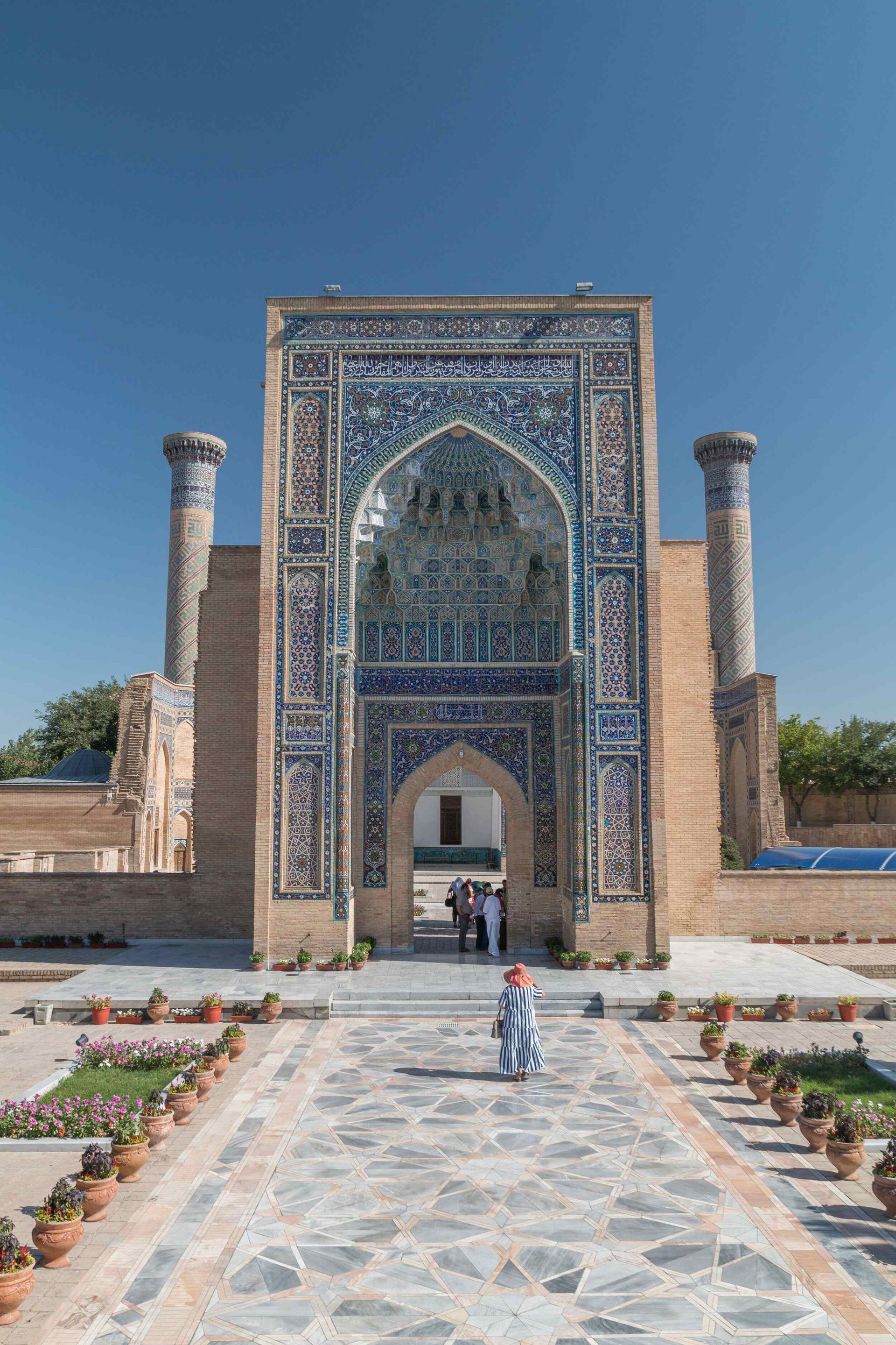- Gur-Emir-Mausoleum: Die Pracht, die zu Timurs Lebzeiten herrschte, sollte auch nach seinem Tode weiterstrahlen. So ließ er 1403/4 für sich und seine Familie eine großartige Grabstätte errichten. Neben dem überkuppelten, fast 35 Meter hohen Mausoleum stehen zwei mit spiralig umlaufenden Mosaiken verzierte Minarette. Im Inneren überwiegen über dem Sockelband aus Onyx die Farben Gold und Blau; aus den Wänden treten Reliefornamente plastisch hervor.