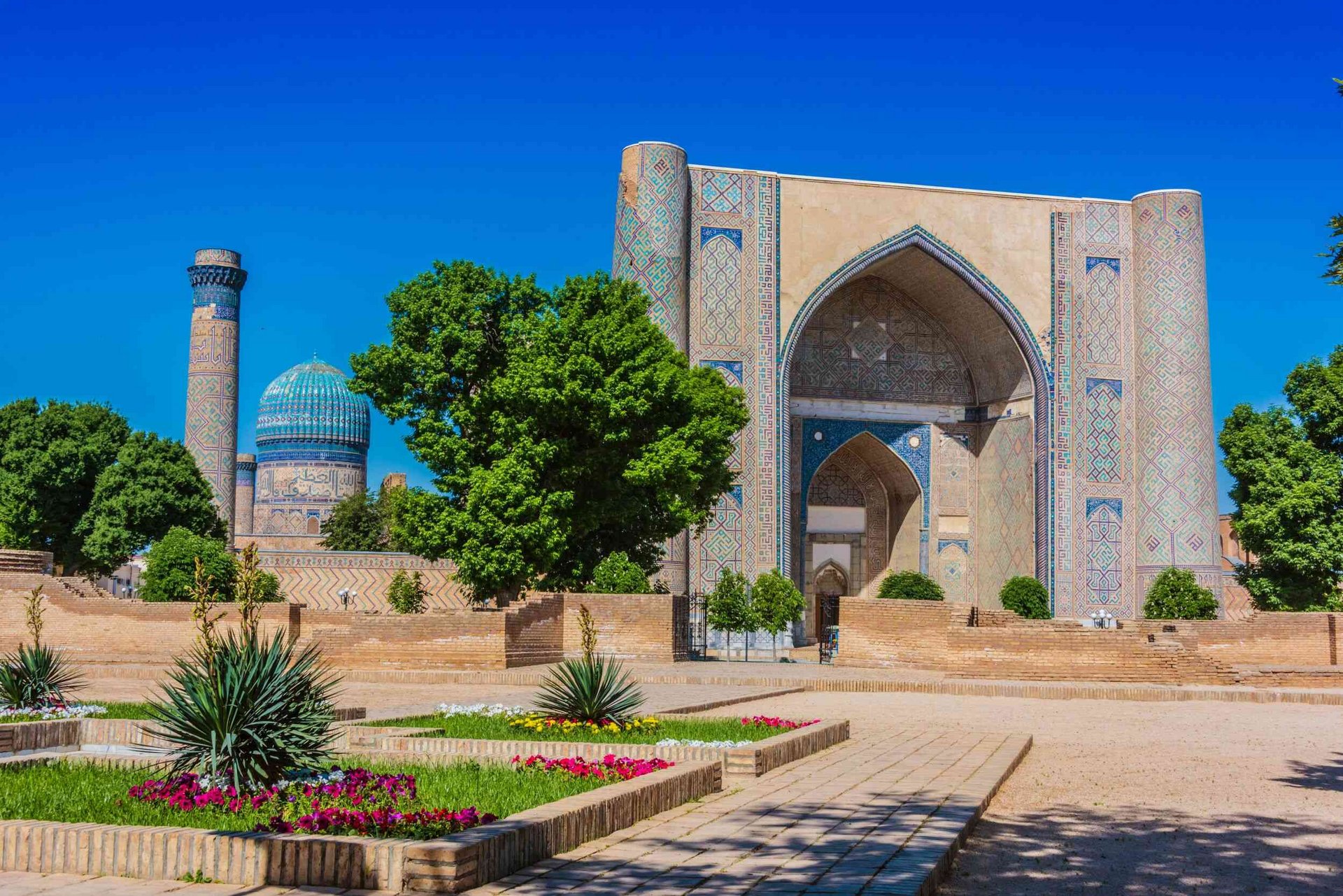 - Bibi-Khanum-Moschee: Timur, Ende des 14. Jahrhunderts der mächtigste Herrscher der islamischen Welt, erbaute um 1400 die Moschee, um seiner Bedeutung Ausdruck zu verleihen. Im 15. Jahrhundert suchte das Gotteshaus an Größe und Pracht seinesgleichen, und auch heute zählt sie zu den wichtigsten Sehenswürdigkeiten Samarkands. Den fast 40 Meter hohen, zentralen Kuppelbau der Moschee erreicht man durch ein gleichhohes Paradeportal. Zu der Anlage gehören zudem zwei kleinere flankierende Kuppelbauten und die Umfassungsmauer umlaufende, nach innen offene Galeriegänge. Die Moschee ist aufwändig mit farbiger Keramik, goldenen Fayencen, Stuckaturen und Wandmalereien verziert. Ihre heute wieder imposante Erscheinung machten umfassende Restaurierungsarbeiten an dem zur Ruine zerfallenem Ensemble möglich.