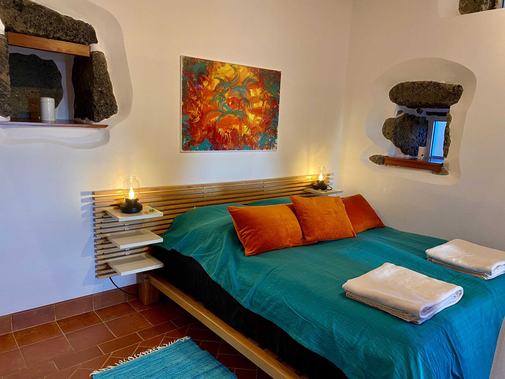 Casa Pico (T1 / 54 m²): 2005 komplett restauriertes und vollständig ausgestattetes Ferienhaus mit separatem Schlafzimmer (2 Einzelbetten, können zu einem Doppelbett kombiniert oder durch Paravant getrennt werden und großem Einbauschrank), Wohnzimmer mit Essbereich, kleiner Gasheizung vielseitiger Bibliothek, Stereoanlage, Musik-CD's, Hörbüchern, diversen Filmen und Spielen, voll ausgestatteter Küchenzeile (mit 4-Flammen Elektroherd, separatem Backofen, Kühlschrank mit kleinem Eisfach, Toaster, Wasserkocher, Kapsel-Kaffeemaschine und French Press), privatem Badezimmer (mit Handtüchern und Haarfön), großer überdachter Terrasse mit wunderschönem Garten- und Meerblick