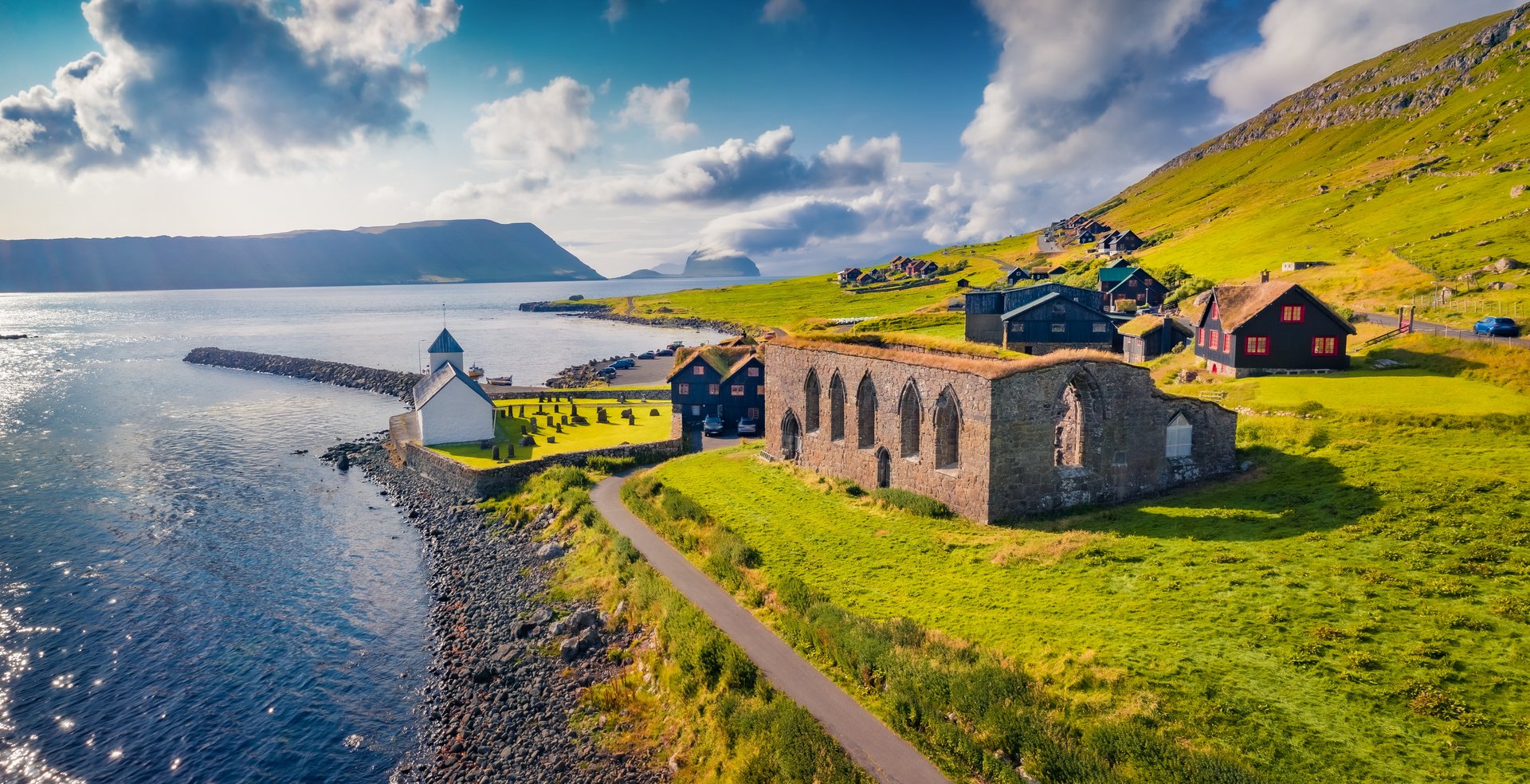 Der heutige Tag steht ganz im Zeichen der färöischen Vergangenheit und Tradition. Auf der Insel Sandoy besuchen Sie die Kirche von Sandur und erkunden die kleinen Orte Húsavík und Dalur - beschauliche Dörfer, in denen das Inselleben noch authentisch spürbar ist. An der Westküste erinnert ein gestrandetes Wrack an die Herausforderungen früherer Seefahrer. Zurück auf der Insel Streymoy führt der Weg nach Kirkjubøur, dem historischen Zentrum der Färöer. Die Ruinen der St.-Magnus-Kathedrale und die über 900 Jahre alte St.-Olavskirche schaffen eine beeindruckende Verbindung zwischen Geschichte, Glaube und Inselkultur.