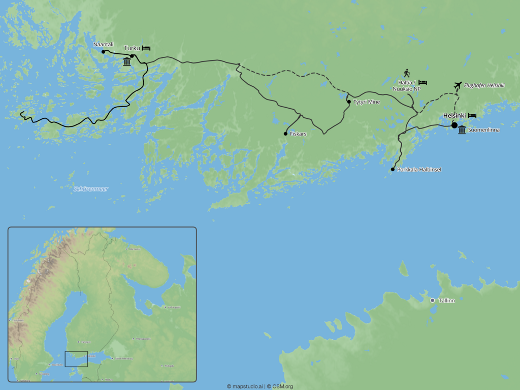 Nach dem Frühstück verabschieden wir uns von der Haltia Lake Lodge und setzen unsere Reise westwärts fort. Der erste Stopp führt uns tief unter die Erde: In der Tytyri Mine bei Lohja tauchen wir ein in die spannende Welt des Kalksteinabbaus - Erdgeschichte, Technik und Industrie kommen hier eindrucksvoll zusammen. Danach geht es weiter nach Fiskars: Der charmante Ort mit seinem historischen Eisenwerk aus dem 17. Jahrhundert ist Ursprung der bekannten finnischen Marke für Scheren und Gartenwerkzeuge und hat sich heute zu einem lebendigen Zentrum für Kunst, Design und Handwerk entwickelt. Ateliers, Galerien und kleine Cafés beleben die alten Industriebauten. Auf dem weiteren Weg nach Turku machen wir noch einen kurzen Halt beim ehemaligen Tuberkulose-Sanatorium in Paimio - einem Werk des finnischen Stararchitekten Alvar Aalto, das als Ikone des Funktionalismus gilt. Am späten Nachmittag erreichen wir Turku und beziehen unser stilvolles Boutique-Hotel Turun Seurahuone. Wir lassen den Tag bei einem gemeinsamen Abendessen in Finnlands ältester Stadt ausklingen.
