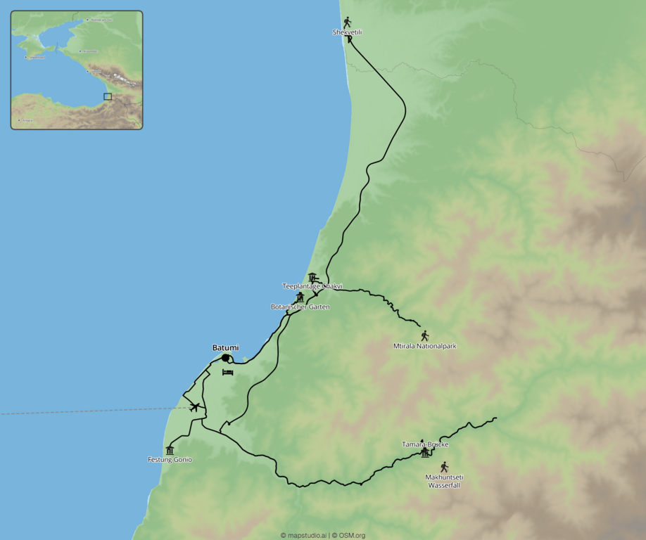 Die Region im Westen Georgiens ist vor allem vom Schwarzen Meer und seiner Küste geprägt, birgt aber auch unerwartete Schätze im Hinterland - von Kulturstätten an der früheren Seidenstraße über die Teeregion Georgiens hin zu Parks mit uralten Baumbeständen. Diese Reise bietet gleichzeitig viel Komfort, da keine Hotelwechsel nötig sind. Das Programm lässt viel Freizeit für eigene Erkundungen, zum Relaxen oder für den Strand.