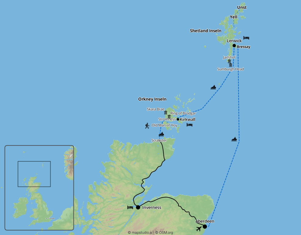 Diese Reise ist nicht für Menschen mit eingeschränkter Mobilität geeignet.Eigenanreise nach Aberdeen. Gerne sind wir Ihnen bei der Anreise per Fähre oder Flugzeug behilflich.