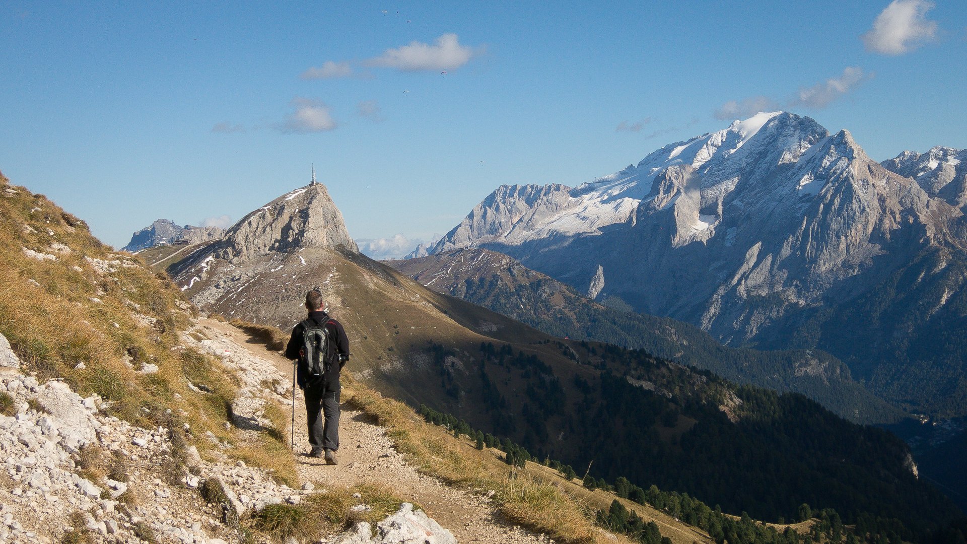 Der Bus bringt uns von Soraga ein kurzes Stück durch das Fassatal hinauf nach Pozza de Fassa. Nach einem kurzen Spaziergang erreichen wir die Talstation und nehmen die Kabinenbahn, die uns hinauf auf den Buffaure bringt, wo sich uns ein bestechend schöner Blick auf das pfeilergestützte Vallaccia-Massiv bietet. Wir wandern einmal gegen den Uhrzeigersinn, quer über die Wiesenhänge des Monte Giumelino hinauf auf den Col de Valvacin und, weiter dem Graskamm folgend, auf den Gipfel des Sas de Adam (2.430 m). Auf dem Weg zur Sella del Brunech öffnet sich ein herrlicher Ausblick auf die Marmolada im Osten.