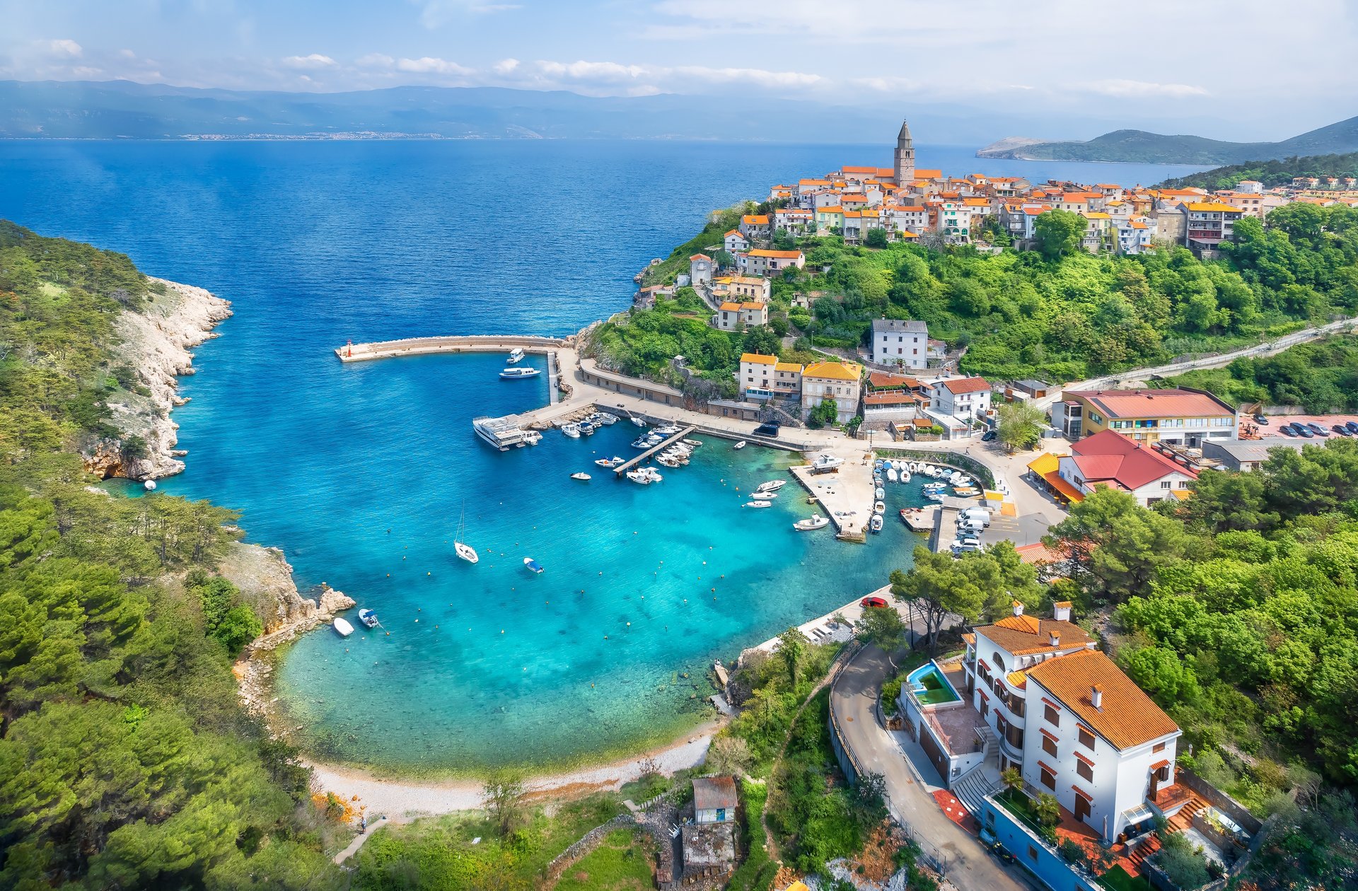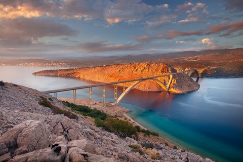 Fahren Sie um die Insel Krk herum oder direkt zum Festland. Überqueren Sie die berühmte Krk-Brücke, begleitet von atemberaubenden Ausblicken auf das Meer und die umliegende Landschaft, und machen Sie sich auf den Weg nach Rijeka.
