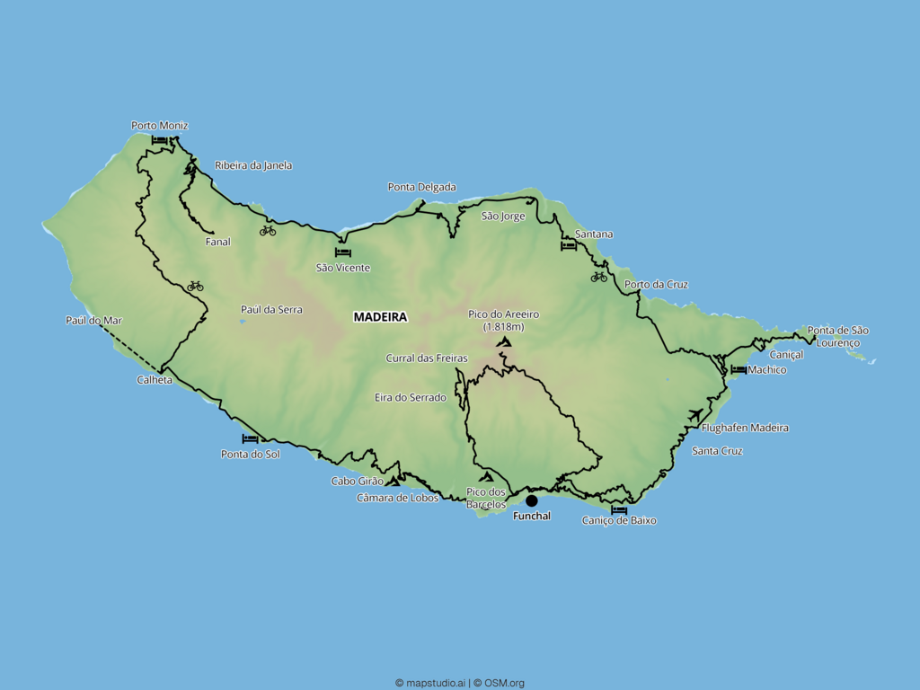 Per E-Bike einmal rund um Madeira auf wenig befahrenen Nebenstraßen, Panoramastraßen oder Passstraßen durch Traumlandschaften zwischen üppig-grünem Bergland und azurblauem Meer. Entlang der Strecke liegen wunderschöne Aussichtspunkte und kleine Buchten, die zum Baden einladen.