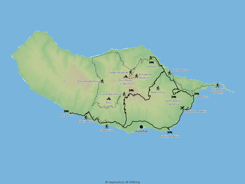 Auf dieser 12-tägigen Trekkingreise erhalten Sie einen umfassenden Eindruck der vielfältigen Insel Madeira: Sie besteigen Gipfel, folgen abgelegenen Levadas und lernen lokale Kultur sowie Küche kennen. Die Etappen führen von bizarrer Vulkanlandschaft im Osten über weitläufige Terrassenfelder und ursprüngliche Orte an der Nordküste bis zu den Wasserfällen im grünen Kessel. Immergrüne Lorbeerwälder wechseln mit kargen Felsformationen und offenen Küstenwegen. Die Gestaltung der Wanderreise erlaubt Raum für Entdeckung, Erholung und intensivere Eindrücke.