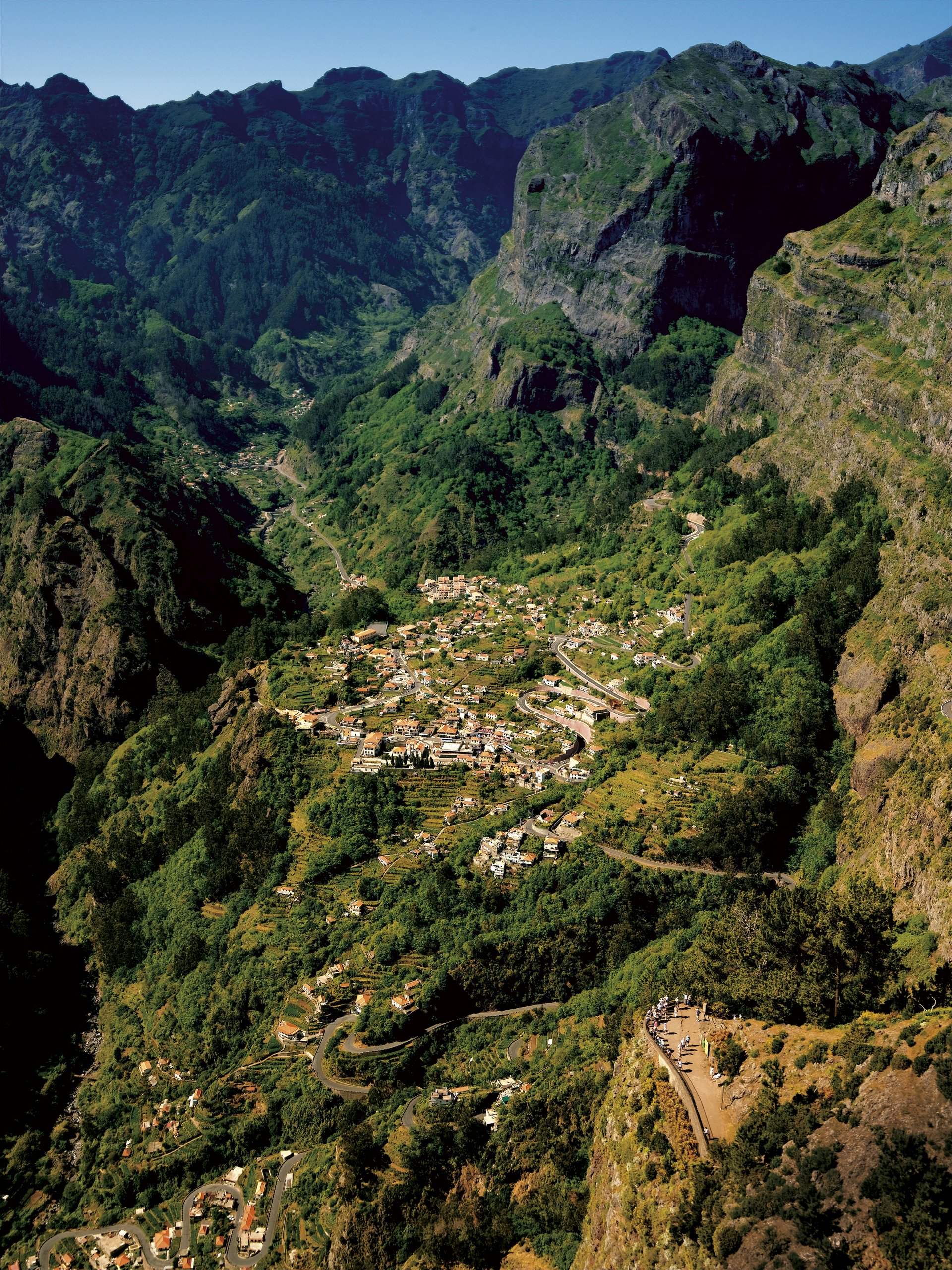 Über einen schönen Waldweg, durchsetzt mit kleinen Tunneln und geschützten Übergängen, geht es hinab in den "Grünen Kessel" Caldeirão Verde. Das immer präsente Wasser schuf eine dichte Vegetation, an dessen Ende Sie ein schwindelerregender Wasserfall erwartet, der sich in einen kristallklaren Teich stürzt. Je nach Wetterbedingung steigen Sie weiter hinunter auf einer der abenteuerlichsten Levadarouten der Insel. Hier wird gewahr, welche Mühen und Aufwand es gekostet haben mag, den Wasserkanal in diese wilde Landschaft zu legen. Im Höllenkessel "Caldeirão Inferno" schafft es kaum ein Lichtstrahl durch das dichte grüne Blattwerk und Sie genießen die Ruhe an diesem mystischen Ort.