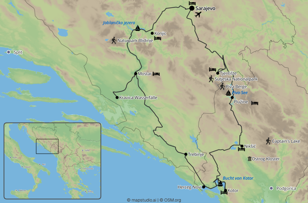 Entdecken Sie den ursprünglichen Balkan auf einer Montenegroreise, die Freiheit und Tiefe vereint. Mit dem Mietwagen steuern Sie flexibel durch die spektakulären Schluchten Bosnien-Herzegowinas und von der mediterranen Kotor-Bucht zu den schroffen Gebirgswelten West-Montenegros. Es erwartet Sie eine Mischung aus aktivem Naturerlebnis – von smaragdgrünen Flüssen bis zu dichten Urwäldern – und Kulturkontrasten in Städten wie Sarajevo, Mostar oder Kotor. Diese Route ist ideal für Reisende, die Authentizität abseits der Massen suchen und das Erbe zweier Länder in eigenem Tempo erkunden wollen.