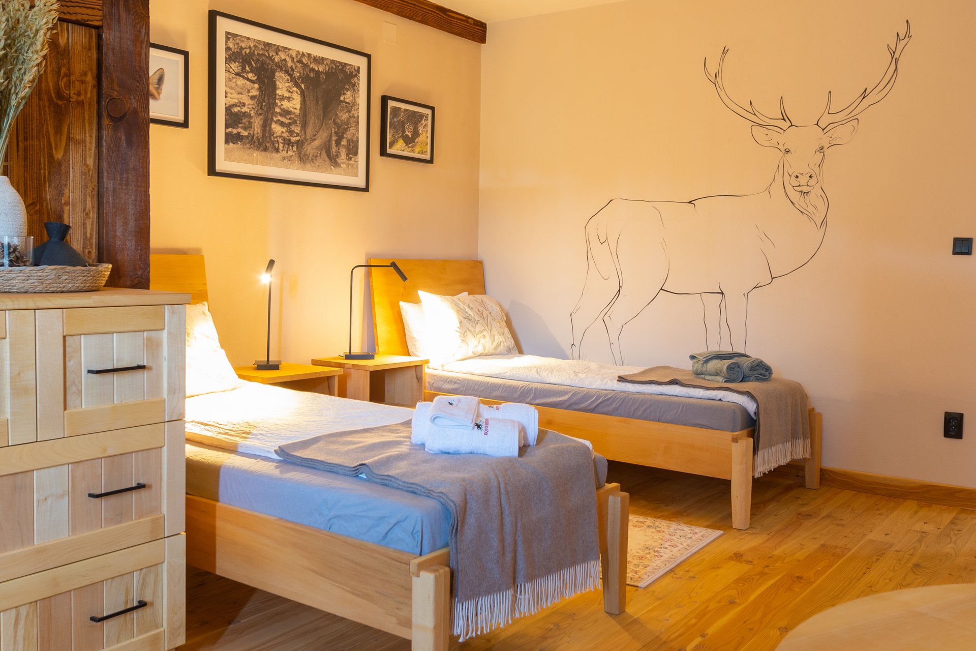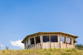 Ausstattung: große Panoramafenster zur Tierbeobachtung, rustikaler Holzofen, Essbereich mit offener Küche, Ferngläser, Naturführer und Informationsmaterial, Hausschuhe, GSM-Empfang (abhängig vom Mobilfunkanbieter), Komposttoiletten direkt vor den Hütten (überdacht erreichbar)