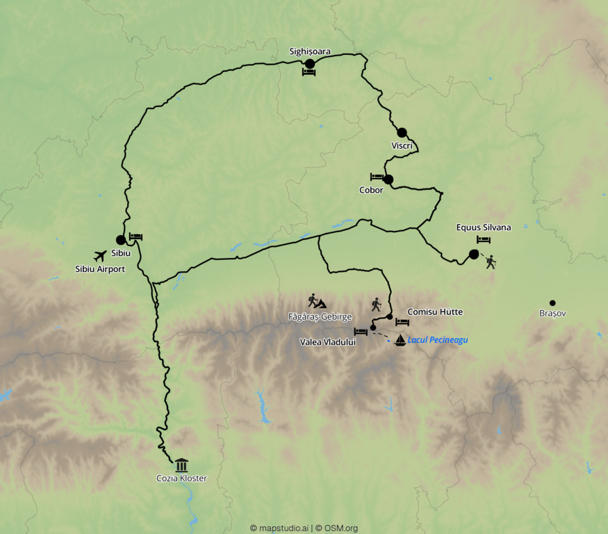 Transfers: Sighisoara - Viscri: 42 km, ca. 40 min; Viscri - Cobor: 57 km, ca. 1,5 Std.