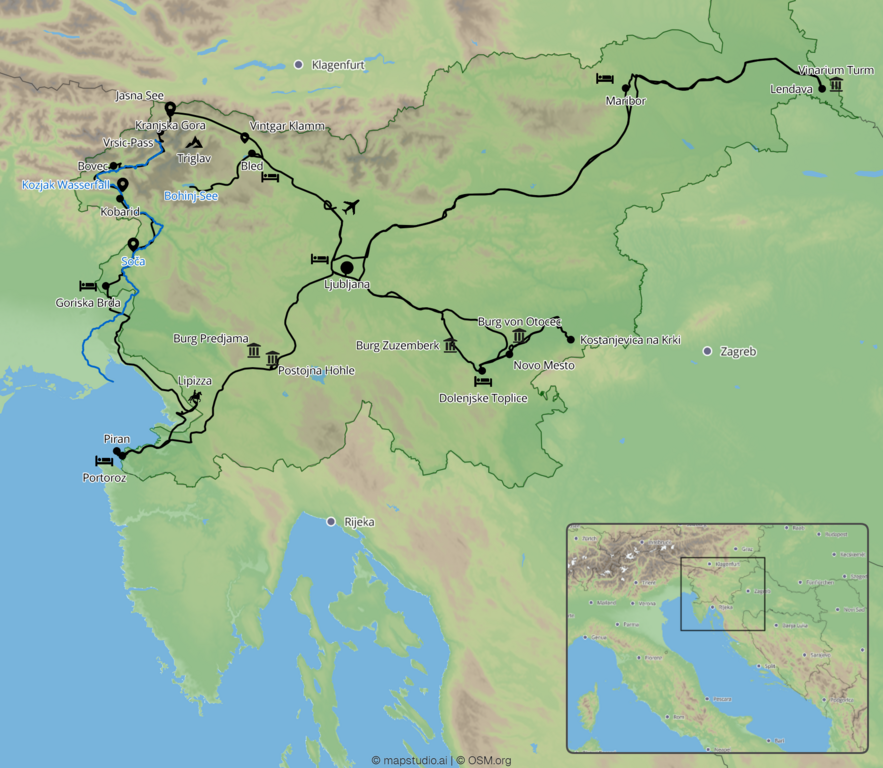 Diese Reise führt Sie in nur 12 Tagen zu den Highlights des kleinen Slowenien - von der Adriaküste im Westen bis hin zu den Weinbergen und Burgen im Osten des Landes. Erleben Sie individuell per Mietwagen Besonderheiten wie die enorme, faszinierende Postojna-Höhle, die majestätischen Lipizzanerpferde, die leuchtend-türkis sprudelnde Soca und die hübschen Städte Ljubljana und Maribor. Natürlich darf auch die kurze aber feine Adriaküste mit den hübschen Städtchen Portoroz und Piran nicht fehlen. Sie werden begeistert sein von der Vielfalt dieses schönen Landes.